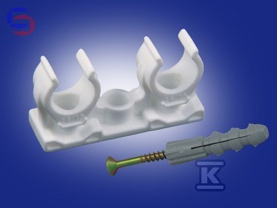 Uchwyt podwójny ONNLINE do rur o średnicy 25-28 mm, wykonany z tworzywa. Zestaw zawiera 4 sztuki wraz ze śrubą i kołkiem, zapewniając solidne mocowanie. Idealny do systemów mocowania rur w instalacjach wewnętrznych.